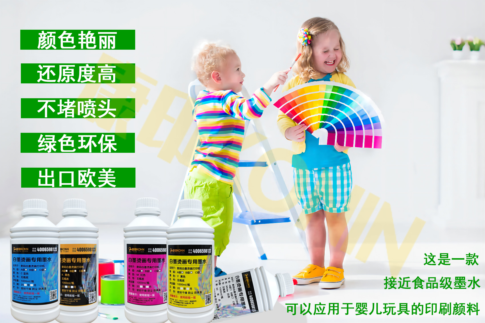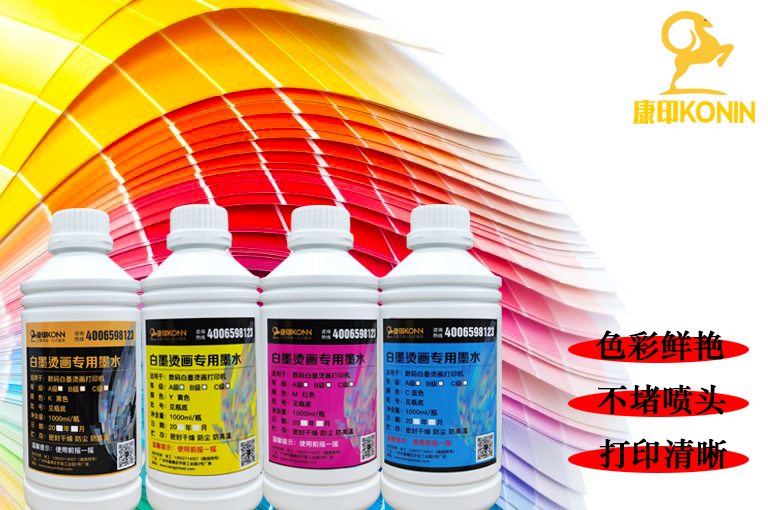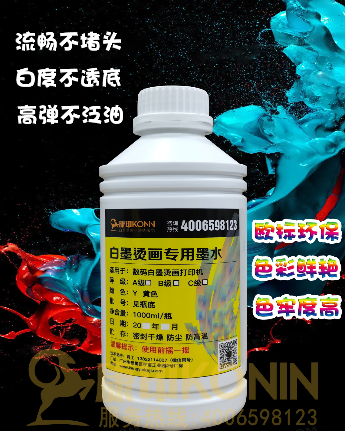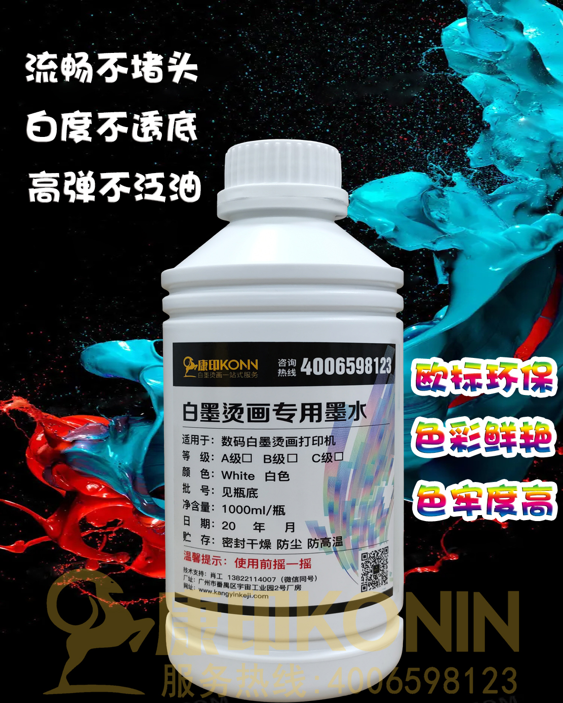 白墨燙畫墨水特點: 彩色墨水:歐標環保 色彩鮮艷 色牢度高 白色墨水:流暢不堵頭 白度不透底 高彈不泛油