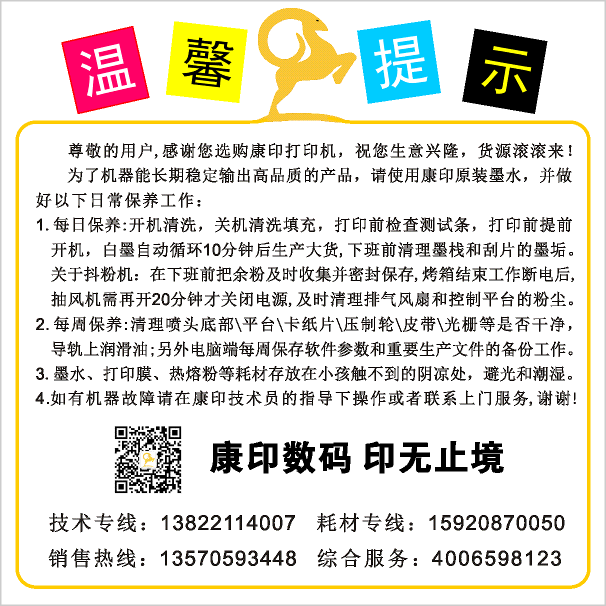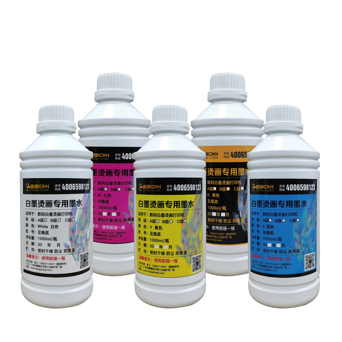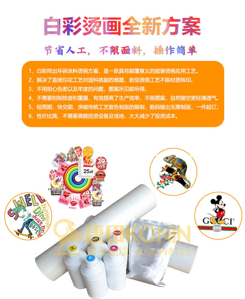 白墨燙畫墨水特點: 彩色墨水:歐標環保 色彩鮮艷 色牢度高 白色墨水:流暢不堵頭 白度不透底 高彈不泛油