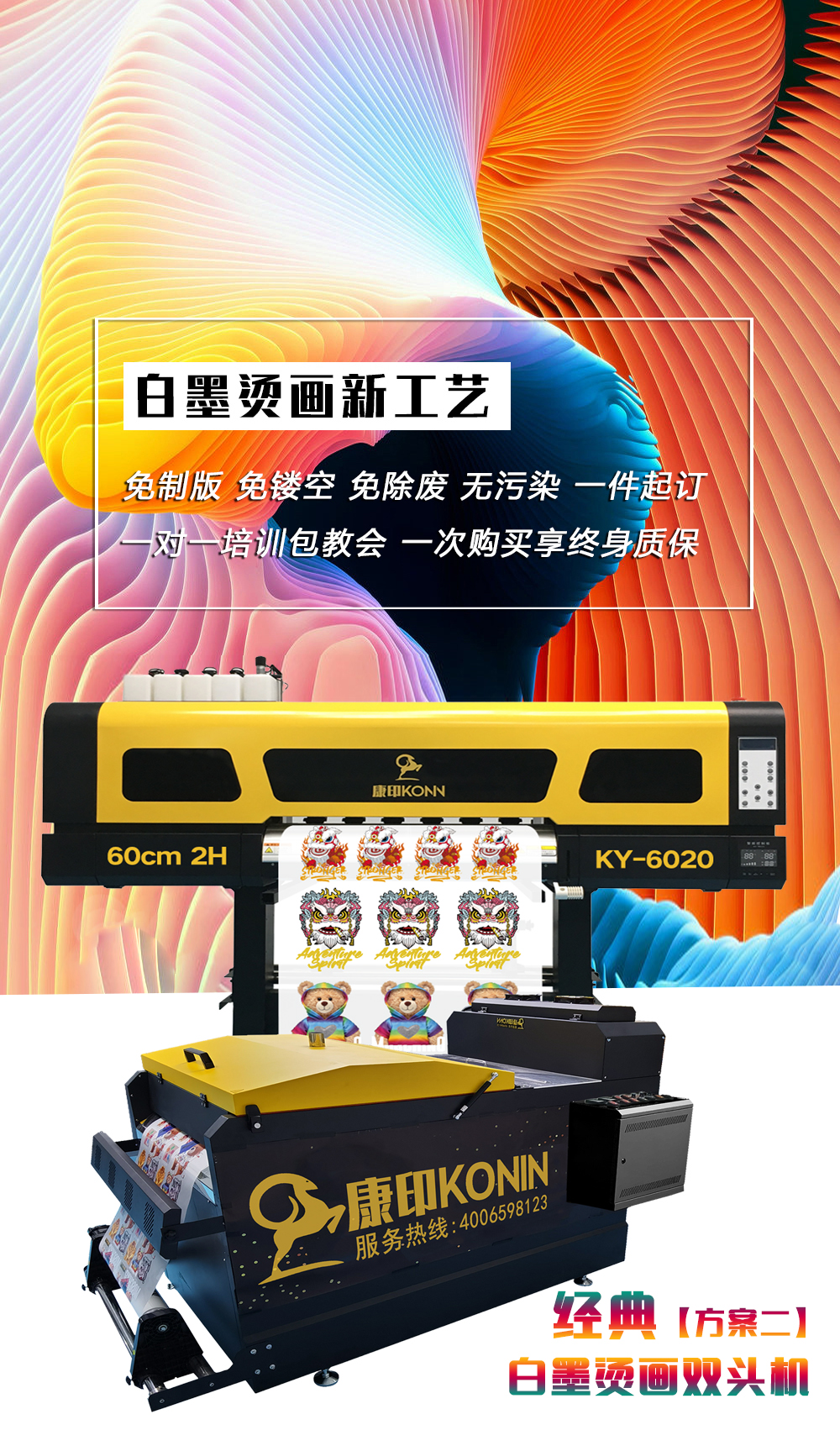 所以白墨燙畫機的打印速度就顯得非常重要。廣州康印白墨燙畫印花機五分鐘即可出成品,完全可以實現即打即印的效果。而且白墨燙畫工藝也非常簡單,一個人就可以完成整個印刷流程,不像傳統的印花廠一樣需要大量的人工進行操作,可以給企業剩下大量的人工成本,試想,這樣方便又快速的白墨燙畫機,那家服裝廠愿意錯過呢。